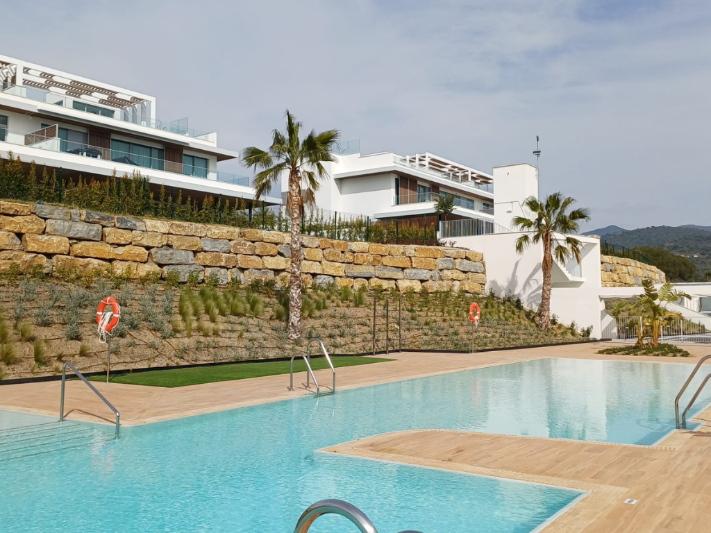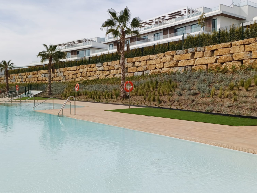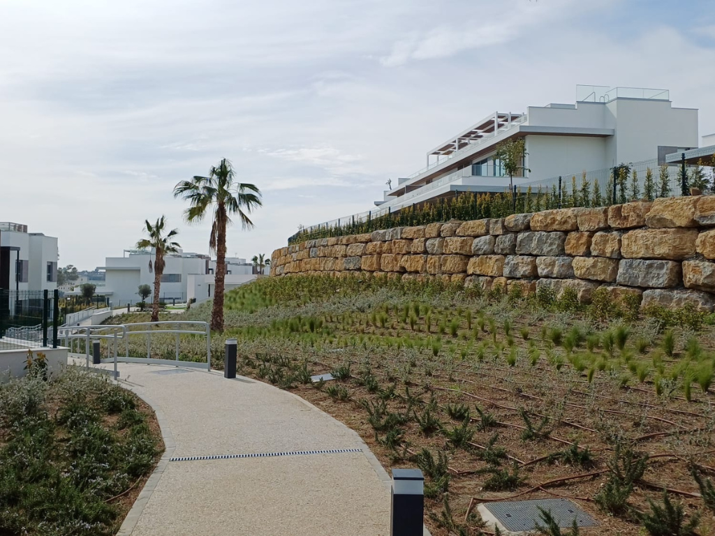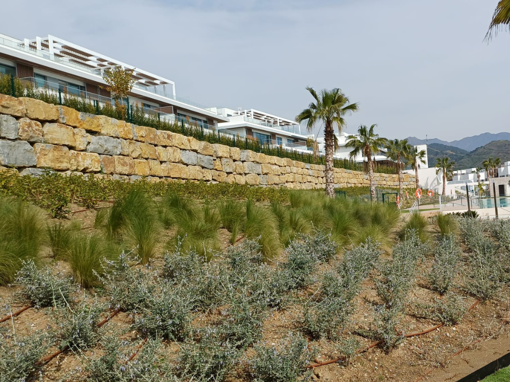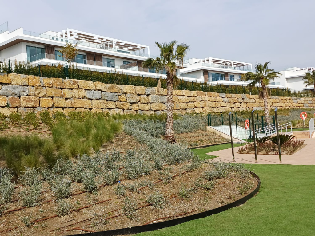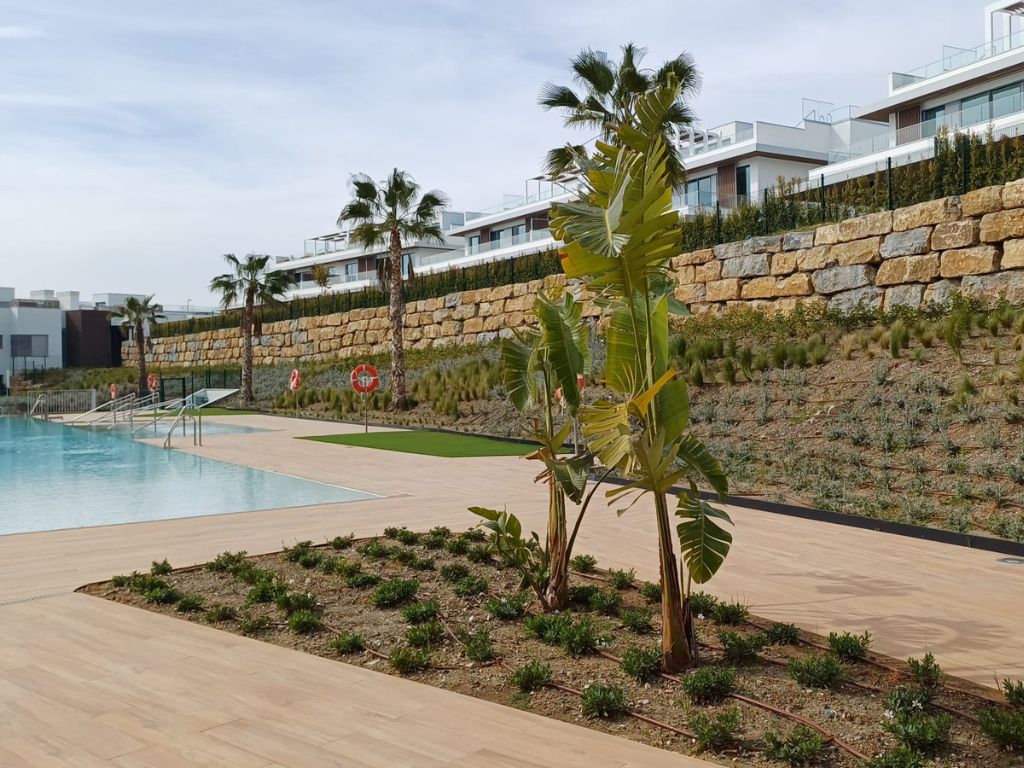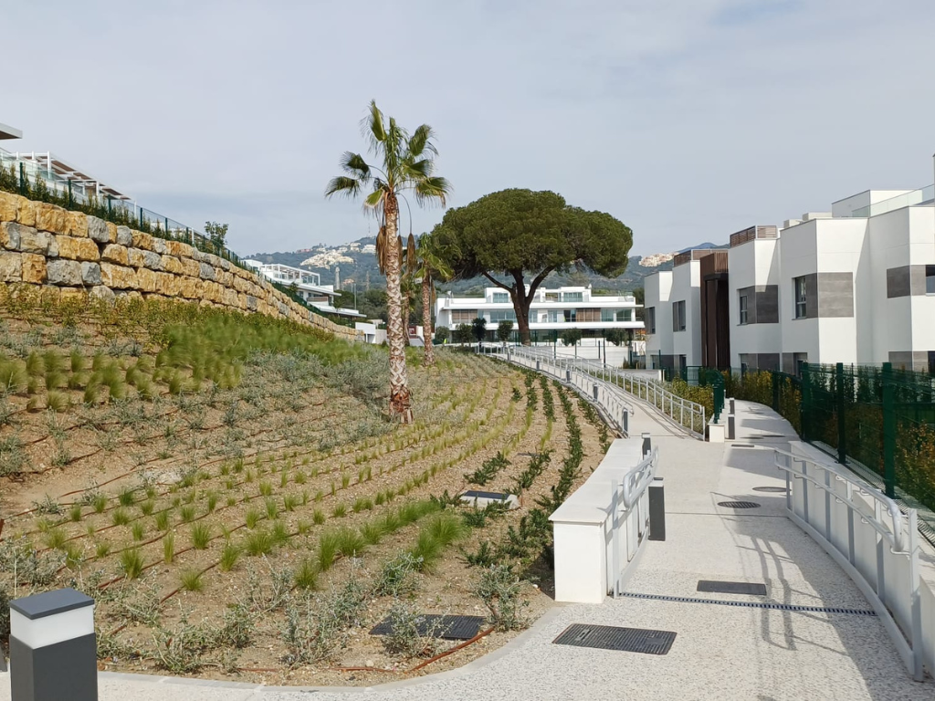 Agrojardín Landscaping ha ejecutado las zonas verdes de Santa Clara Homes, una promoción residencial desarrollada por Neinor Homes en Marbella, en un entorno en contacto directo con el campo de golf. El proyecto se organiza en tres áreas de intervención: zonas comunes, jardines privados en viviendas de planta baja y el perímetro exterior.